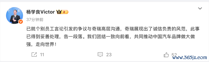 针对奇瑞高管在社媒拉踩吉利新车,浙江吉利控股集团高级副总裁杨学良5月12日下午在社交平台发文回应称,“已就个别员工言论引发的争议与奇瑞高层沟通,奇瑞展现出了诚信负责的风范,此事已得到妥善处理,告一段落。我们团结一致向前看,共同推动中国汽车品牌做大做强,走向世界! ”